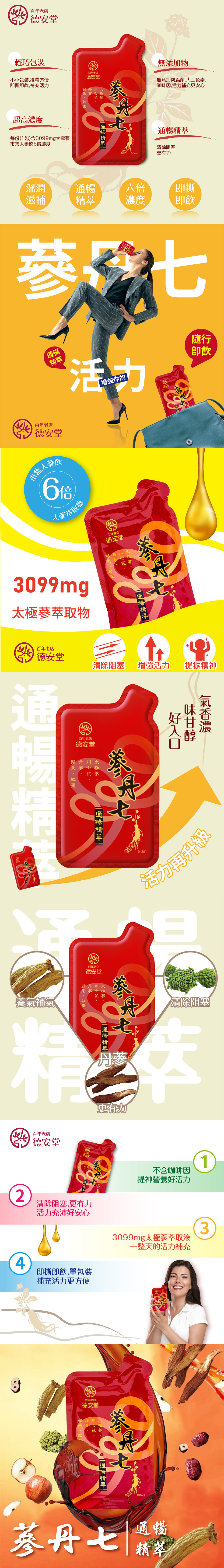 品 名:德安堂蔘丹七通暢精萃(80毫升 X 5包 / 盒)